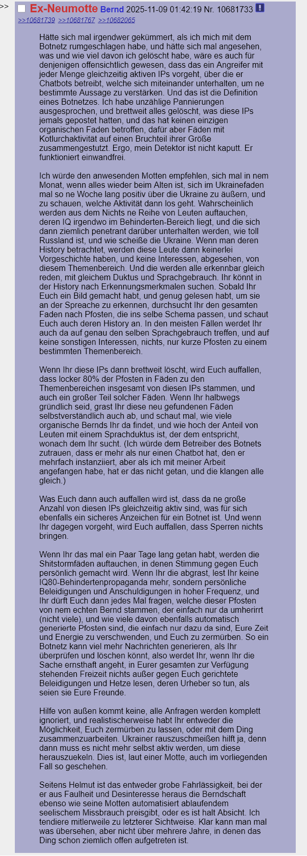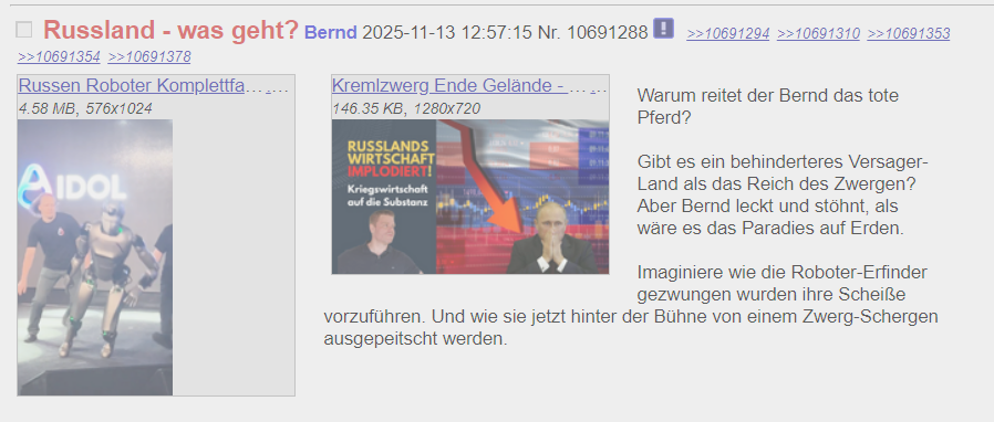 Er hat Probleme damit wenn Bernd schlecht über Russen redet. Es ist schon sehr auffällig dass alle Fäden die gelöscht wurden Russenbezug hatten.