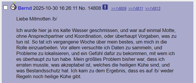 >>19309 Aus Sicht meiner Rolle als stellvertretender Brettadmin war das schon von Beginn an so. Wir haben auch keine Motten (genommen), die einfach nur Hass auf Kohl schieben, weil es das Mottenheim von innen heraus zersetzen würde. Wir wollen und wollten nie einfach nur irgendein Kohl-Protestbrett oder Abklatsch sein, sondern eine eigene Identität entwickeln. Ja, auf Basis von altKC offensichtlich >Als Bernd das letzte Mal von dir hörte, warst du sehr schlecht auf Kohlkanal zu sprechen und hast sogar aktiv drüben Stunk gemacht. Ich gebe zu, da war ich persönlich sehr salzig. Das bezog sich aber nie auf Kohl an sich oder Helmut, sondern an bestimmte Bernde drüben, die aktiv auch hier Stunk gemacht haben. Und ja rückwirkend sehe ich auch, dass das so gewirkt haben muss, dass ich für ganz Kraut spreche, obwohl es einfach nur mein persönlicher Frust war.