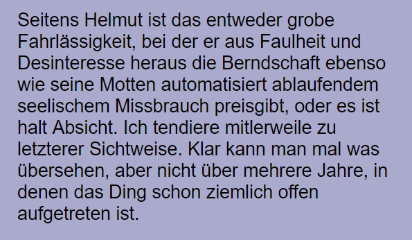 >>20562 Läuft wieder auf der Kadse. Helmut kommt aus seinem Kinder-Kaka einfach nicht raus....