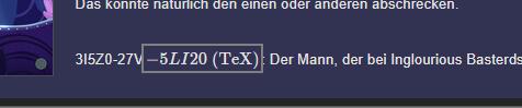>>21097 Dollarzeichen erzeugen LaTeX, was auch ziemlich kühl ist. Keine Ahnung, ob man die mit \ escapen kann, aber mit Tags sollte es sicher auch gehen. Hilft bei Dampfcodes sicher eh, um [code]Il10O auseinanderzuhalten.