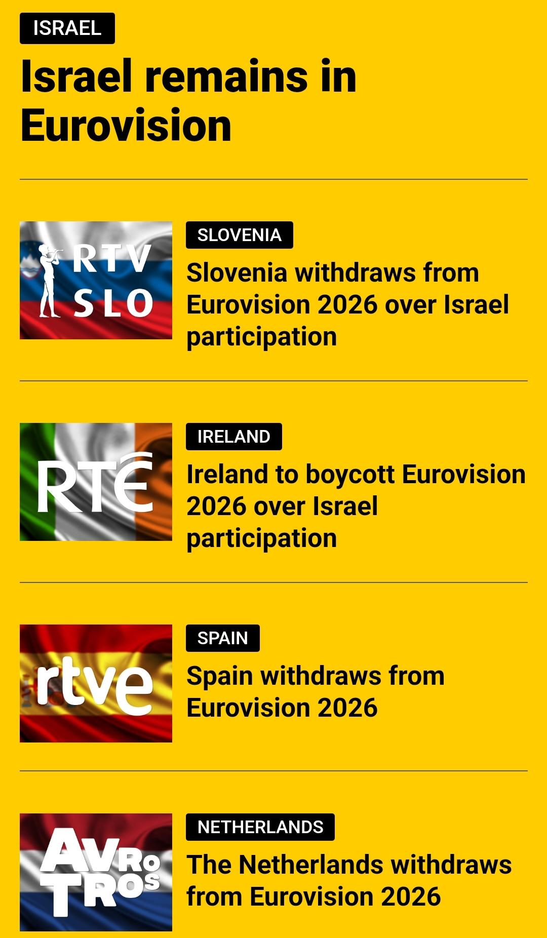 It might only be about a stupid music contest that supposedly nobody watches, but I find this to be a pretty bad escalation. I can't remember any other thing were a whole list of European countries goes so hard against Israel that they would drop out of a large, international cultural event.