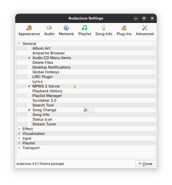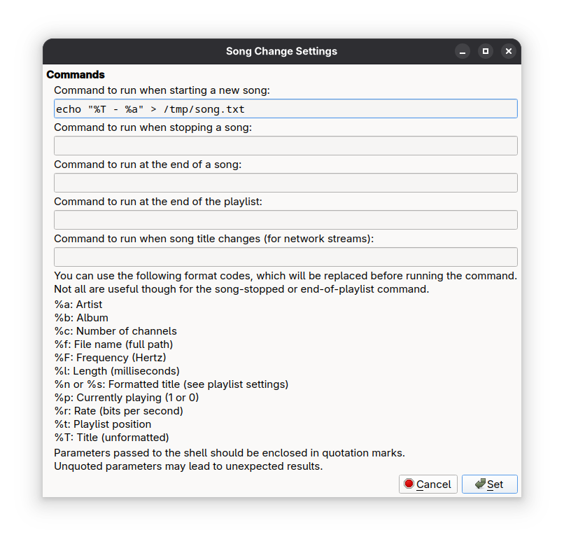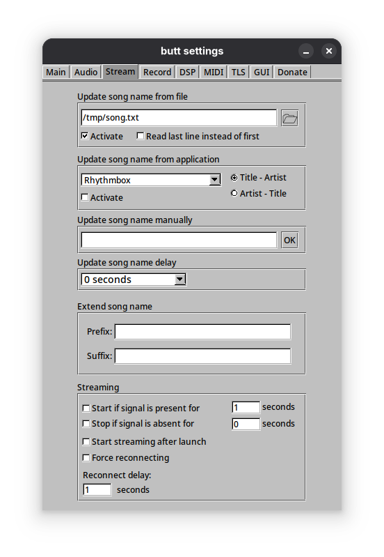 Für das Setup Butt mit Audacious, könnt ihr die Songtitel wie folgt übertragen: 1. In Audacious das Plugin On Change aktivieren und in der obersten Zeile folgendes eintragen: echo "%T - %a" > /tmp/song.txt 2. Diesen Dateipfad in Butt angeben. Format und Dateipfad können natürlich nach Belieben angepasst werden. Keine Ahnung, warum es mit der untersten Option nicht klappt, obwohl diese explizit für Ströms angegeben ist.