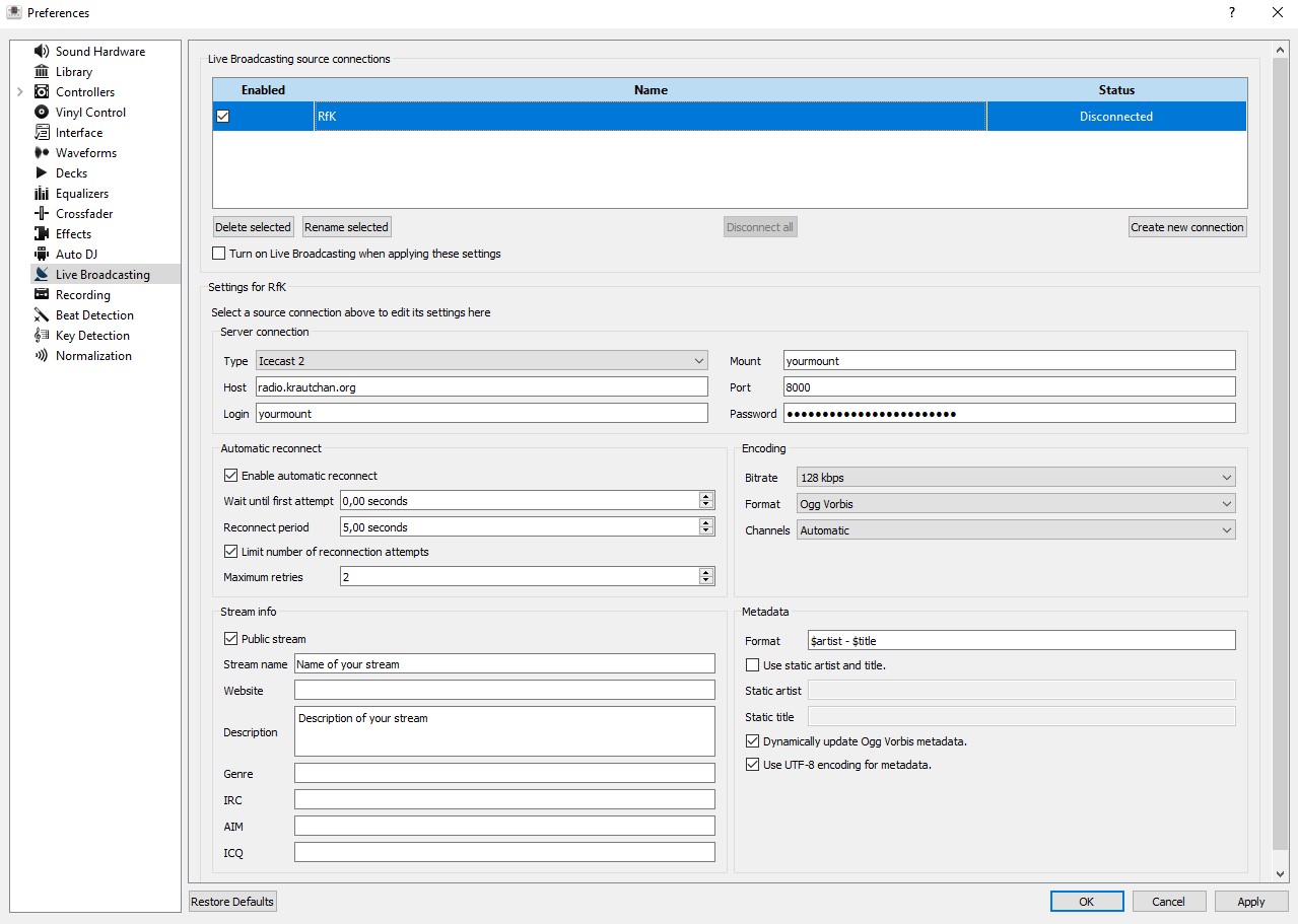 Dieser Faden soll Neubienen und ehemalige Strömbernde dabei helfen, wie man beim neuen RfK strömen kann. Beim neuen RfK gibt es fest zugewiesene Mountpoints die an ein Nutzerkonto mit Nutzernamen und Passwort gebunden sind. Wir haben die Aktiven von Radio Ernstiwan übernommen. Alle die sich also jetzt im Kalender unter https://radio.krautchan.org/files/calendarlogin.php finden müssen nichts machen und können direkt loslegen mit ihren alten Zugangsdaten. Beispielkonfiguration gibt es im nächsten Pfosten. Danke an Ernst-admin. Für alle anderen gelten folgende zwei Möglichkeiten: 1) An manchen Tagen werden wir ein offenes Nutzerkonto aktiv schalten. Die Zugangsdaten sind: Username: RfK / Passwort: Laurameer / Mountpoint: /RfK Es ist ein einziger Sitz. Wer zuerst kommt, mahlt zuerst. Wir werden die Tage an denen dies stattfindet vorher ankündigen. 2) Wer ein festes Nutzerkonto möchte weil er ein ehemaliger Strömbernd ist, oder sich sicher ist, das er öfter mal strömen werden wird, der möge sich dann bitte bei uns im IRC melden. Elfe gibt es unter https://krautchan.org/irc.html auch für im Brausierer. Dort besprechen wir mit dir das weitere vorgehen und du bekommst die Kontodaten vertraulich zugestellt. Wie oben schon geschrieben, folgt im nächsten Pfosten eine Anleitung mixxx, butt, OBS und ffmpeg. Wenn Fragen bestehen, Anregungen/Kritik oder Käfer, einfach in einem bestehenden Radiofaden auf >>>/kc/ melden oder im IRC.