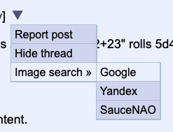 Dies ist der Faden, in dem Bernd sich Features wünschen kann. Ich fange mal an: 1. Bildersuche. Der Vierkanal hat das und es ist eigentlich ziemlich einfach. Per Knopfdruck werden folgende Elfenjungen eingeblendet: > https://lens.google.com/uploadbyurl?url=$BILDURL > https://www.yandex.com/images/search?url=${BILDURL}&rpt=imageview > https://saucenao.com/search.php?url=${BILDURL} 2. Bild bearbeiten. Alt-KC hatte eine Option, die ein Bild in den Shi-Painter geworfen hat, sodass man z.B. Bingos ausfüllen, oder anmerkungen wie "FETT" in Bilder kritzeln konnte. Ein kurzer Blick in die Doku von wPaint sagt mir, dass das auch gehen sollte.
