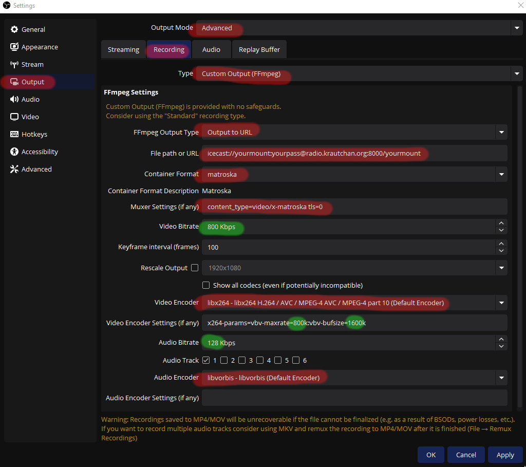 Die relevanten OBS-Konfigurationen zum Kopieren: File path or URL: icecast://yourmount:yourpass@radio.krautchan.org:8000/yourmount Muxer Settings (if any): content_type=video/x-matroska tls=0 Video Encoder Settings (if any): x264-params=vbv-maxrate=800k:vbv-bufsize=1600k Den Ström starten kann man dann mit "Start Recording". Ja wirklich, nicht "Start Streaming". Für den Rest in OBS: Das Rote genau so einstellen wie es da steht, das Grüne kann und soll man an die eigenen Bedürfnisse anpassen. Was warum aus welchen Gründen wie sinnvoll ist, damit könnte man ganze Bildschirmseiten füllen, da gibt es auch noch mehr Einstellungen, die relevant sind. Falls jemand Interesse hat, kann gerne meer Information geliefert werden. Fürs Erste nur der wichtigste Hinweis: Macht euch beim Videoströmen nicht aus Fersehen nakt, und testet vorher, was ihr strömt, indem ihr statt "Output to URL" "Output to File" wählt. Dann könnt ihr euch lokal ansehen, ob das in Ordnung ist, und ob die Kwalität mit der konfigurierten Bitrate gut genug ist!