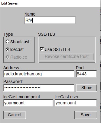 Hier die Schirmschüsse für die bekannten Strömwerkzeuge, die als funktionierend konfirmiert werden konnten. Das bekannte Problem, dass SSL-Ströms (Port 8443) manchmal hängen bleiben, ist offenbar auch in der neuen Icecast-Version noch präsent. Wer damit Probleme hat, kann auf den nicht-SSL-Port (Port 8000) ausweichen. Generell gilt: ogg ist als Strömformat besser geeignet als mp3, mp3 funktioniert aber auch. Was übrigens nichts damit zu tun hat, welches Format eure Quell-Audiodateien haben, es geht nur um das Strömformat. - butt: Geht mit und ohne SSL. - mixxx: Geht mit mixxx v2.2.3 offenbar nur ohne SSL, falls jemand mixxx nutzt und mit SSL strömt: Bitte berichten! - OBS (für Videoströms): Geht mit und ohne SSL, mit SSL ist der Ström aber nach Abschaltung direkt hängen geblieben, daher Schirmschuss ohne SSL. - ffmpeg (Audio und Video): Geht nur ohne SSL. Video nur mit webm oder matroska Audio nur mit ogg. Das ffmpeg kommando mit GPU-Beschleunigung. Getestet auf Linux für Windows müsste man das x11grab und das alsa ändern: