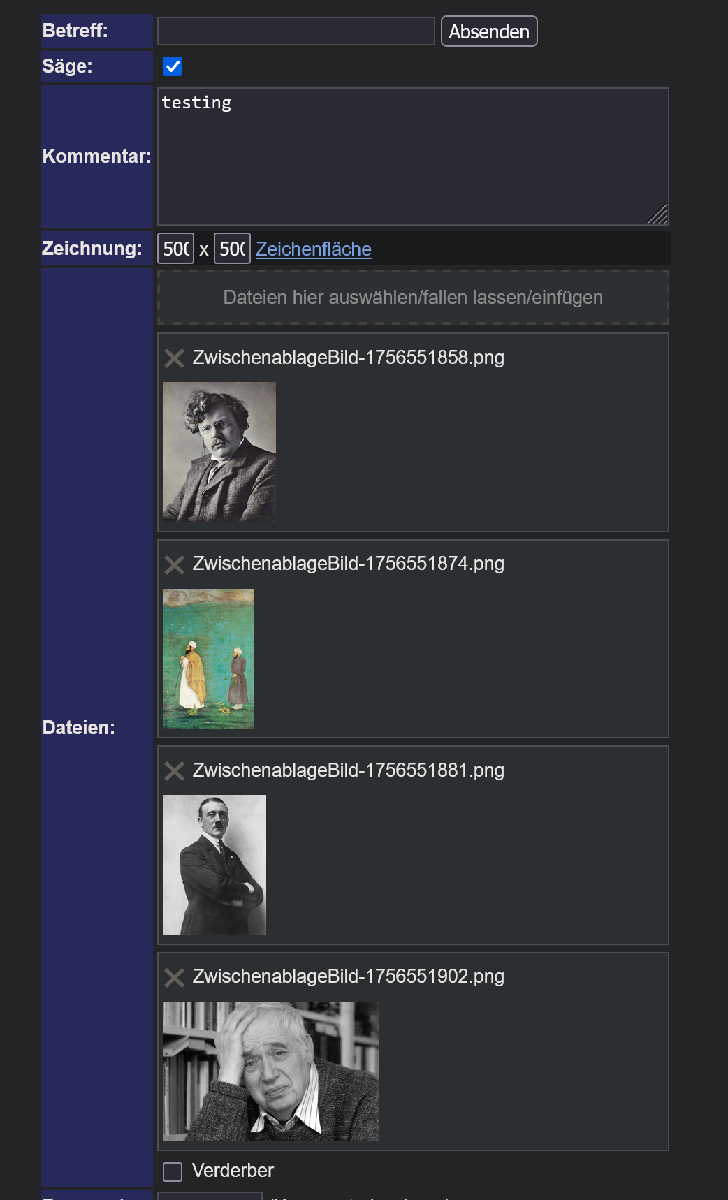 This was in Firefox under Fedora. I tried it under windows and couldn't post even with one image. Maybe this is helpful to Generalmajor: Uncaught (in promise) TypeError: SubtleCrypto.digest: Argument 2 could not be converted to any of: ArrayBufferView, ArrayBuffer. onloadend https://krautchan.org/.static/js/postCommon.js?c=1747318602816:540 newCheckExistance https://krautchan.org/.static/js/postCommon.js?c=1747318602816:534 newGetFilesToUpload https://krautchan.org/.static/js/postCommon.js?c=1747318602816:597 processFilesToPost https://krautchan.org/.static/js/thread.js?c=1747318602820:979 processReplyRequest https://krautchan.org/.static/js/thread.js?c=1747318602820:1002 checked https://krautchan.org/.static/js/thread.js?c=1747318602820:1069 handleConnectionResponse https://krautchan.org/.static/js/api.js?c=1749256797435:310 connectionStateChanged https://krautchan.org/.static/js/api.js?c=1749256797435:384 formApiRequest https://krautchan.org/.static/js/api.js?c=1749256797435:350 postReply https://krautchan.org/.static/js/thread.js?c=1747318602820:1047 postCommon.js:540:21 onloadend https://krautchan.org/.static/js/postCommon.js?c=1747318602816:540 AsyncFunctionThrow self-hosted:804 (Async: async) newCheckExistance https://krautchan.org/.static/js/postCommon.js?c=1747318602816:534 newGetFilesToUpload https://krautchan.org/.static/js/postCommon.js?c=1747318602816:597 processFilesToPost https://krautchan.org/.static/js/thread.js?c=1747318602820:979 processReplyRequest https://krautchan.org/.static/js/thread.js?c=1747318602820:1002 checked https://krautchan.org/.static/js/thread.js?c=1747318602820:1069 handleConnectionResponse https://krautchan.org/.static/js/api.js?c=1749256797435:310 connectionStateChanged https://krautchan.org/.static/js/api.js?c=1749256797435:384 (Async: EventHandlerNonNull) formApiRequest https://krautchan.org/.static/js/api.js?c=1749256797435:350 postReply https://krautchan.org/.static/js/thread.js?c=1747318602820:1047